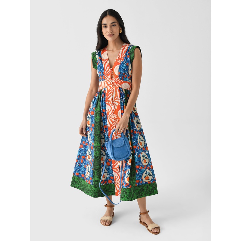 The April Dress features a flattering v-neckline, fitted bodice, and flowing skirt, the artfully placed Orange Grove mixed print makes a bold yet harmonious statement.