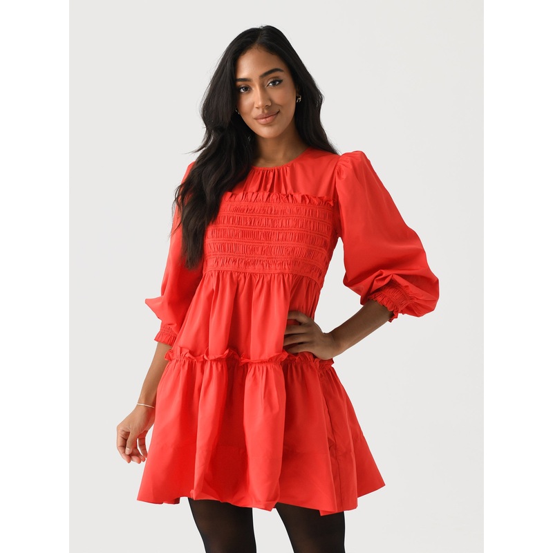 DESCRIPTION:A bright red puff-sleeve dress made from polyester taffeta and finished with smocked details and ruffle trims.FEATURES:Round NecklineBack Zip ClosureSmocked BodicePuff SleevesTiered SkirtRuffle TrimsMini Silhouette100% Polyester TaffetaClassic