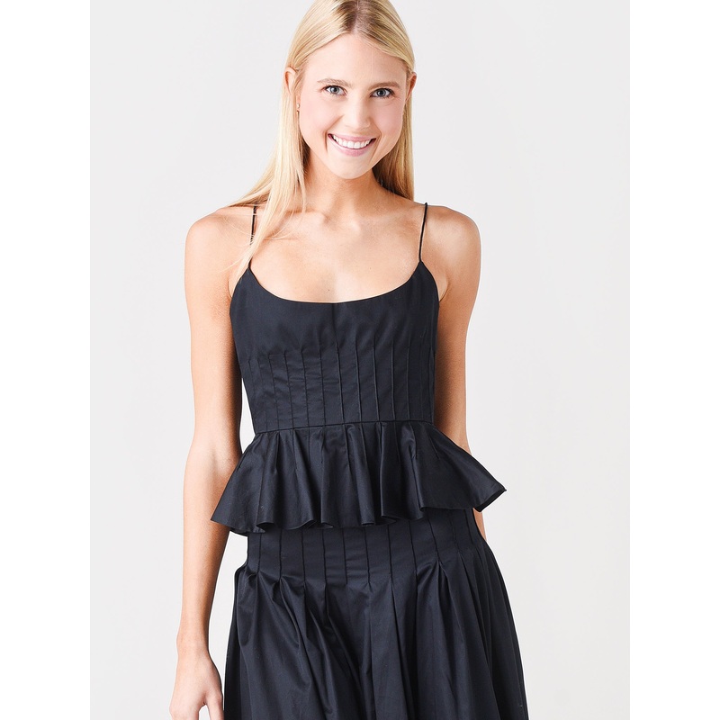 DESCRIPTION:The Hunter Bell Women's Celia Top is sleek, sophisticated, and perfect for your next party.FEATURES:Tank Top Low Round NecklineSpaghetti StapsFitted Bodice w/ PleatsPeplum HemHidden Zip at BackLightweight, Non-Stretch Cotton Sateen Fabrication1