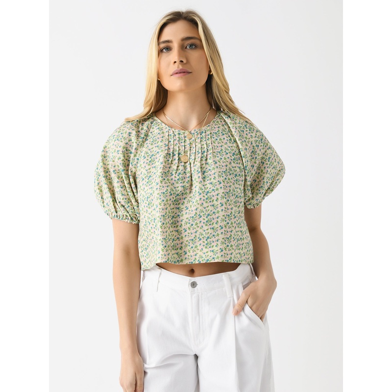 A slightly cropped blouse with puff sleeves and a vintage-inspired floral print.