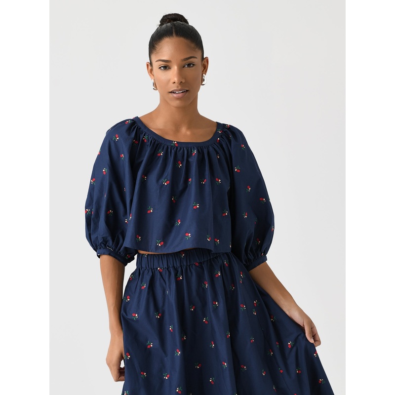 DESCRIPTION:A slightly cropped puff sleeve top made from cotton broadcloth with an embroidered rose design.FEATURES:Round NecklineShirred DetailsHalf-Length Puff SleevesEmbroidered DesignCropped Silhouette100% CottonClassic FitModel is wearing size Small t