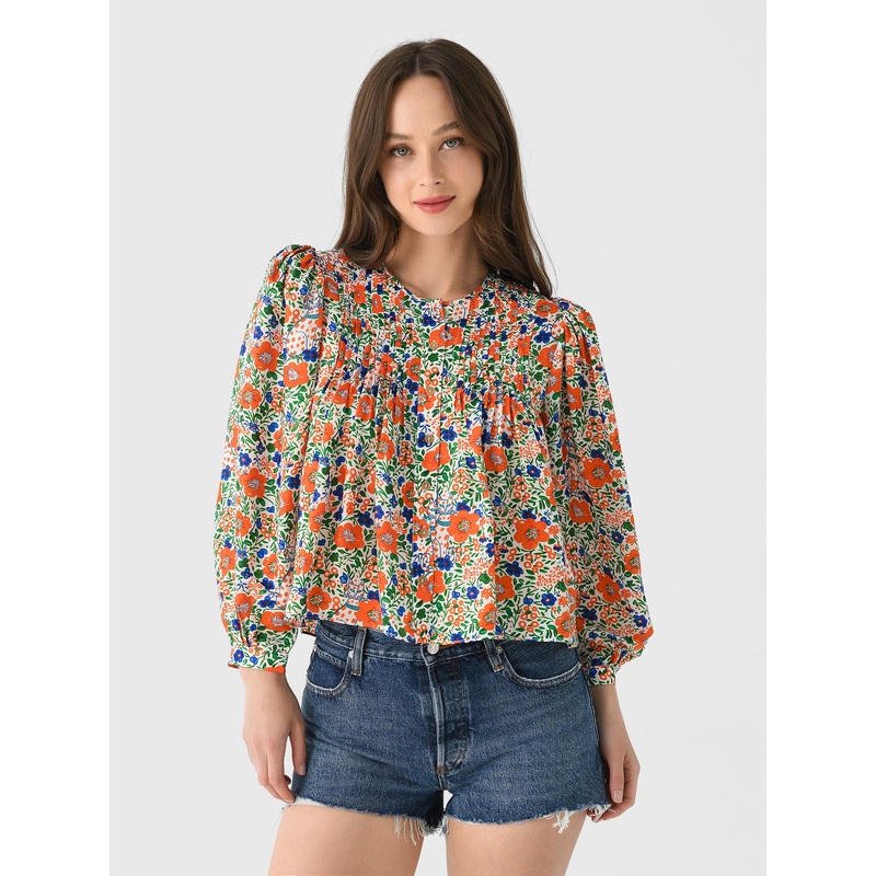 DESCRIPTION:Add a playful touch to your wardrobe with the Daphne Top, featuring whimsical print on a timeless silhouette. Delicate pintuck detailing accents the button placket, while a classic neckline and long, full sleeves with button cuffs complete this