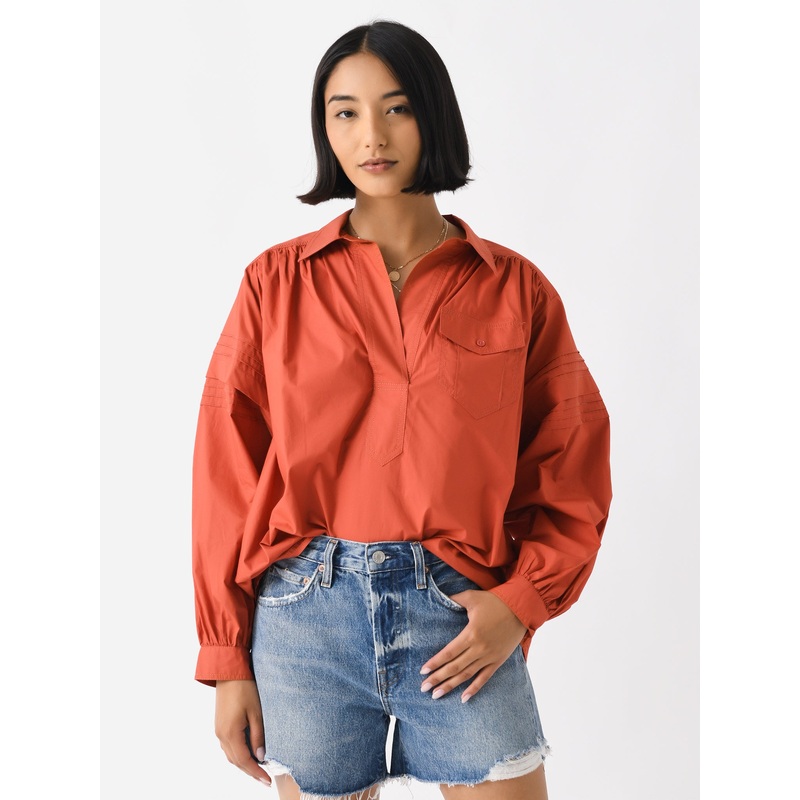 DESCRIPTION:A timeless shirt made from lightweight cotton poplin with an open collar design and blouson sleeves.FEATURES:Spread CollarPartial PlacketLeft Chest PocketPleated Sleeve DetailButton Cuffs100% Cotton PoplinRelaxed FitModel is wearing size Small