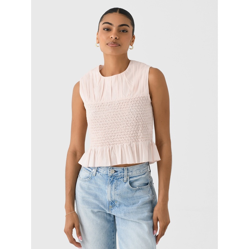 A sleeveless smocked blouse made from a soft rayon blend with gathered details and a ruffled hem.