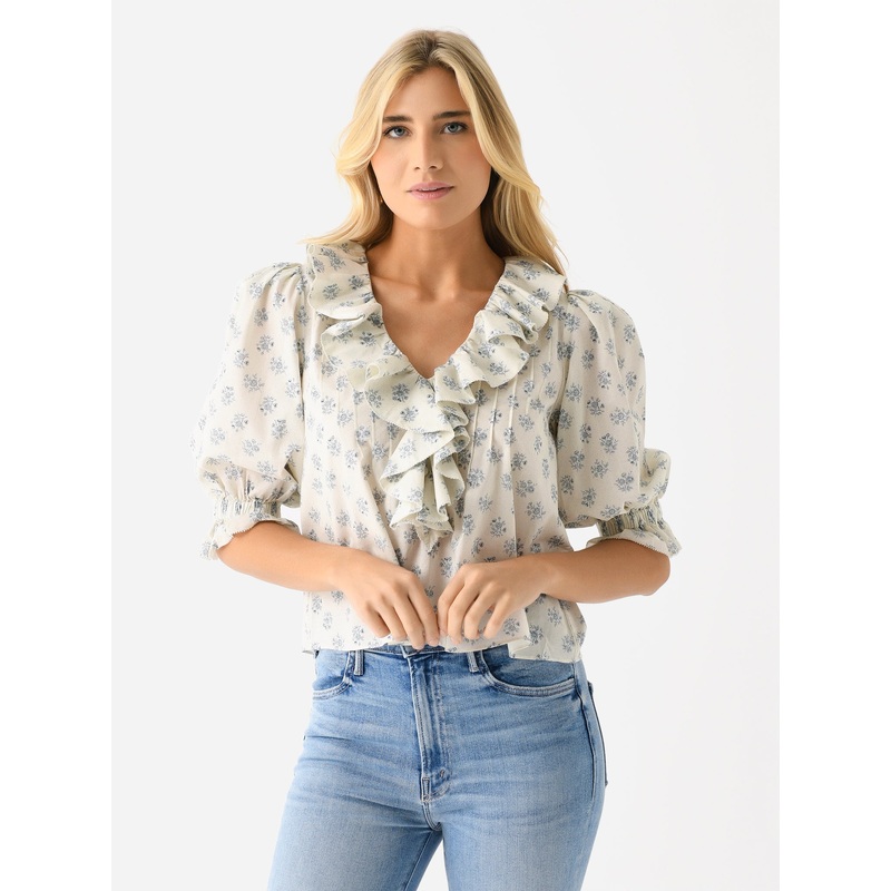 DESCRIPTION:An elegant blouse made from lightweight cotton voile with a floral block print and a ruffle-trimmed neckline.FEATURES:V-NecklineHalf-Length Puff SleevesRuffle TrimPintuck DetailsAll-Over Novelty Print100% Cotton VoileClassic FitModel is wearing