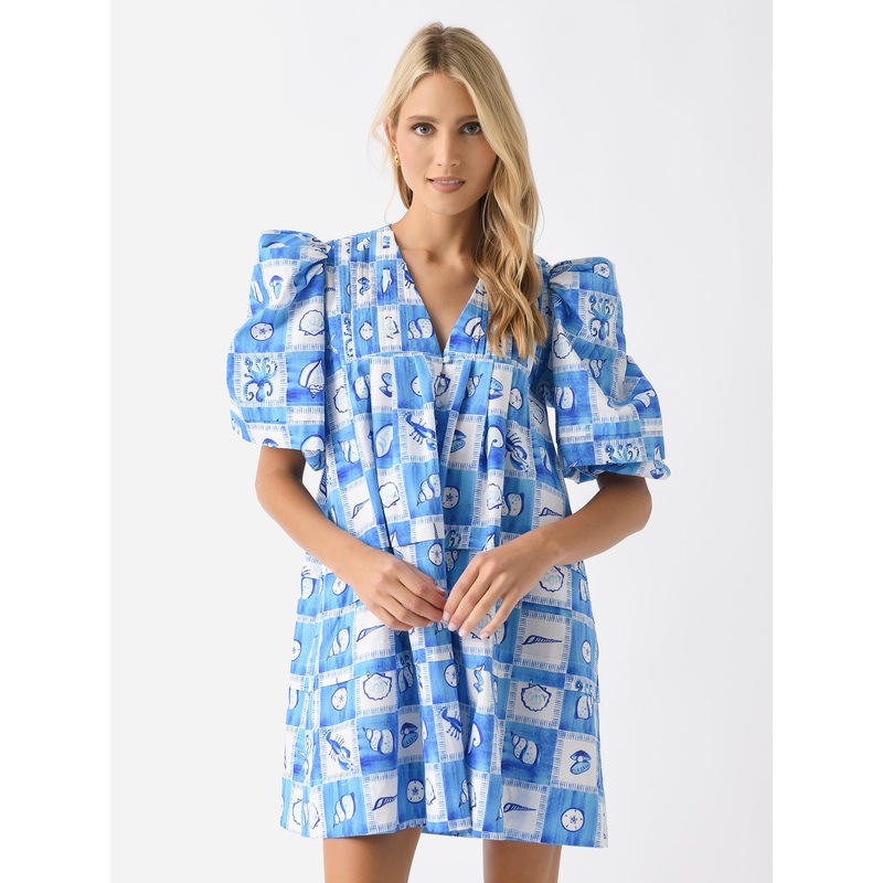 DESCRIPTION:A relaxed dress made from lightweight cotton poplin with a custom sea shell print and pleated and pintucked details.FEATURES:V-NecklinePartial Button PlacketPintucked BodiceElbow-Length Puff SleevesElastic CuffsOn-Seam PocketsTiered PanelsMini