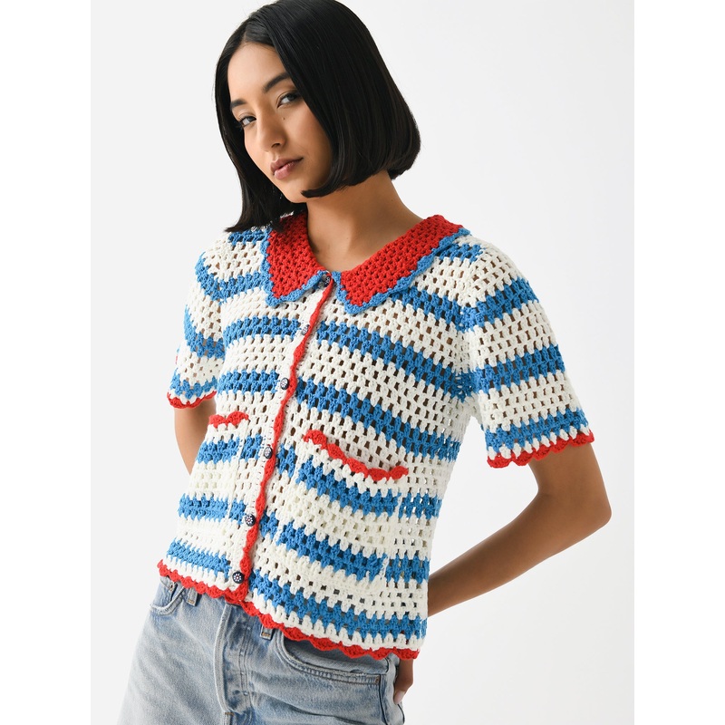 DESCRIPTION:A lightweight button-down top made from striped crochet fabric with a contrast collar and scalloped trims.FEATURES:Spread CollarPatch PocketsButton ClosureScalloped TrimsCrochet Fabrication100% AcrylicClassic FitModel is wearing size Small top.