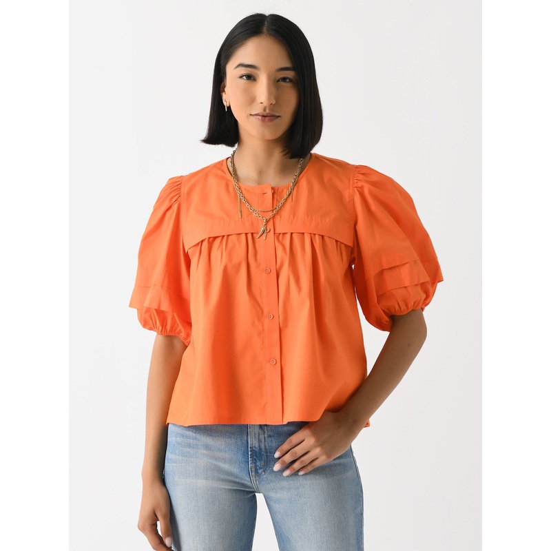 DESCRIPTION:A lightweight blouse made from cotton poplin with bubble sleeves and a shirred yoke for a flattering fit.FEATURES:Round NecklineBubble SleevesShirred YokeButton-Down Front100% Cotton PoplinClassic FitModel is wearing size Small top.Model's Meas