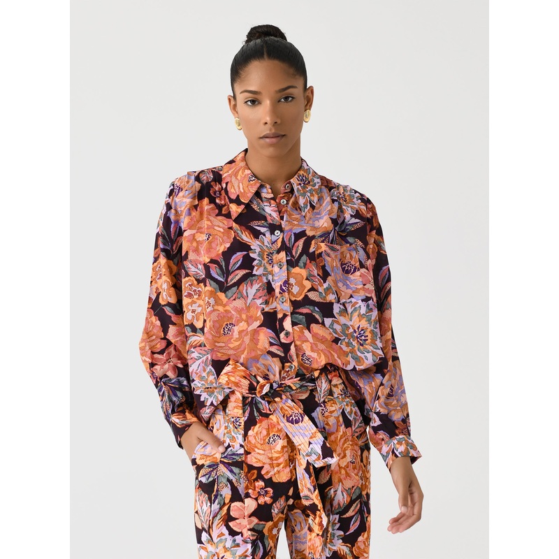 An oversized button-down shirt made from lightweight fabric with a painterly floral print.