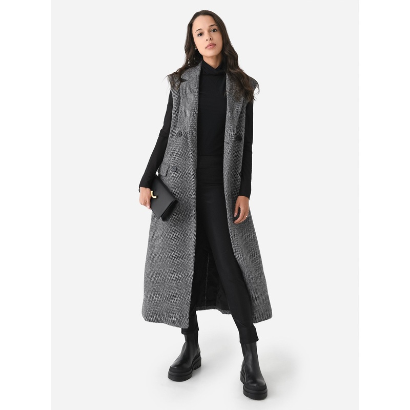 Long vest with a herringbone stitched pattern and a double-breasted closure.