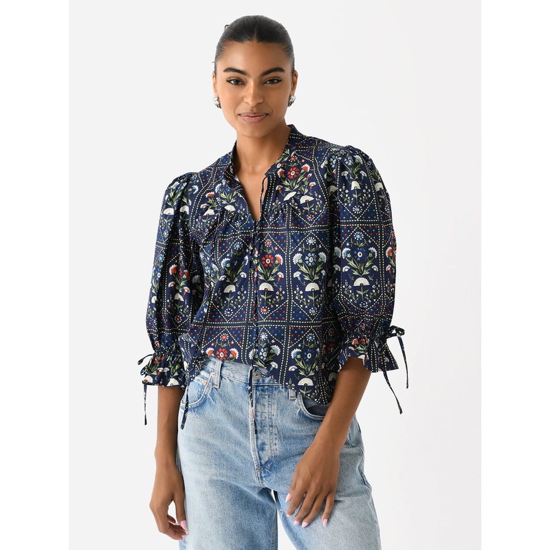 DESCRIPTION:A lightweight cotton printed blouse featuring feminine puff sleeves and self-tie details.FEATURES:V-NecklineSelf-Tie KeyholePartial Button PlacketHalf-Length Puff SleevesAll-Over Novelty Print100% CottonRelaxed FitModel is wearing size Small to