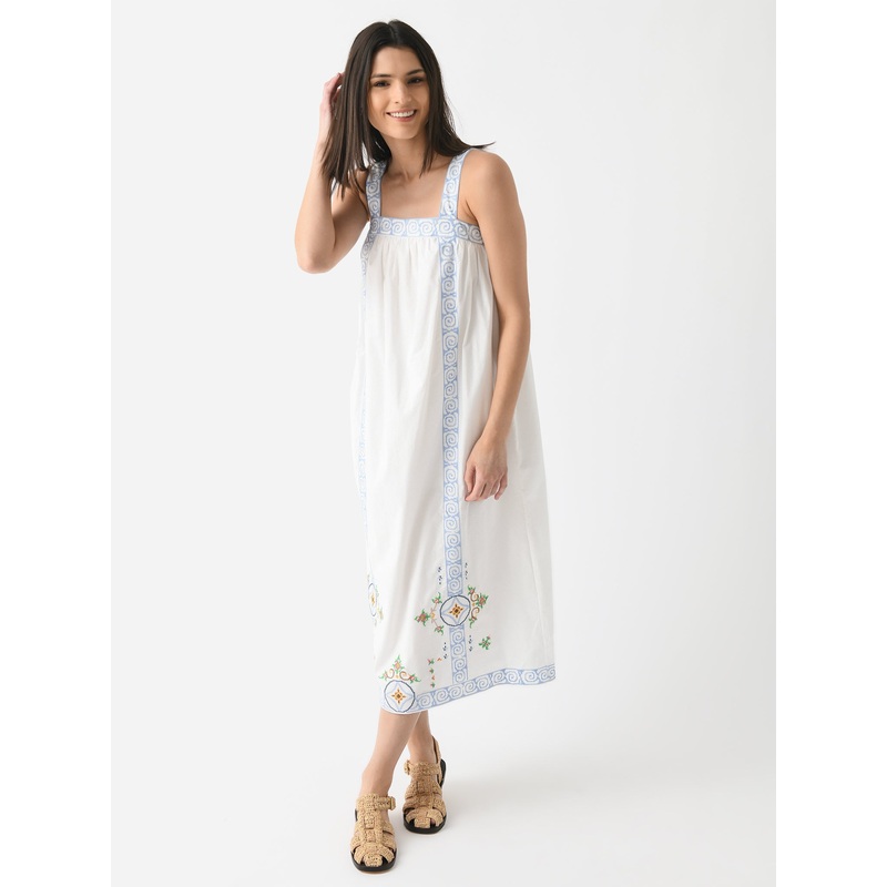 DESCRIPTION:An airy cotton maxi dress adorned with mosaic embroidery and apron-style straps.FEATURES:Square NecklineWide StrapsBack Zip ClosureEmbroidered DesignMaxi Silhouette100% CottonRelaxed FitModel is wearing size 2 dress.Model's Measurements: Height