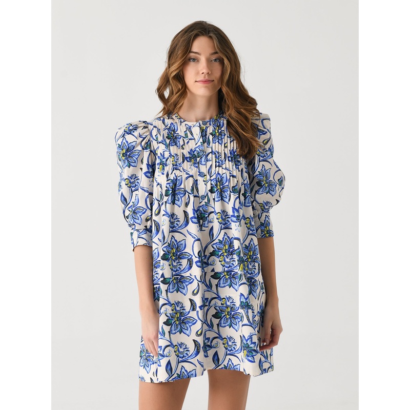 This elegant dress features a classic neckline, delicate pintuck details, and graceful puff sleeves. The button-front placket adds a touch of refinement, making it perfect for any occasion.