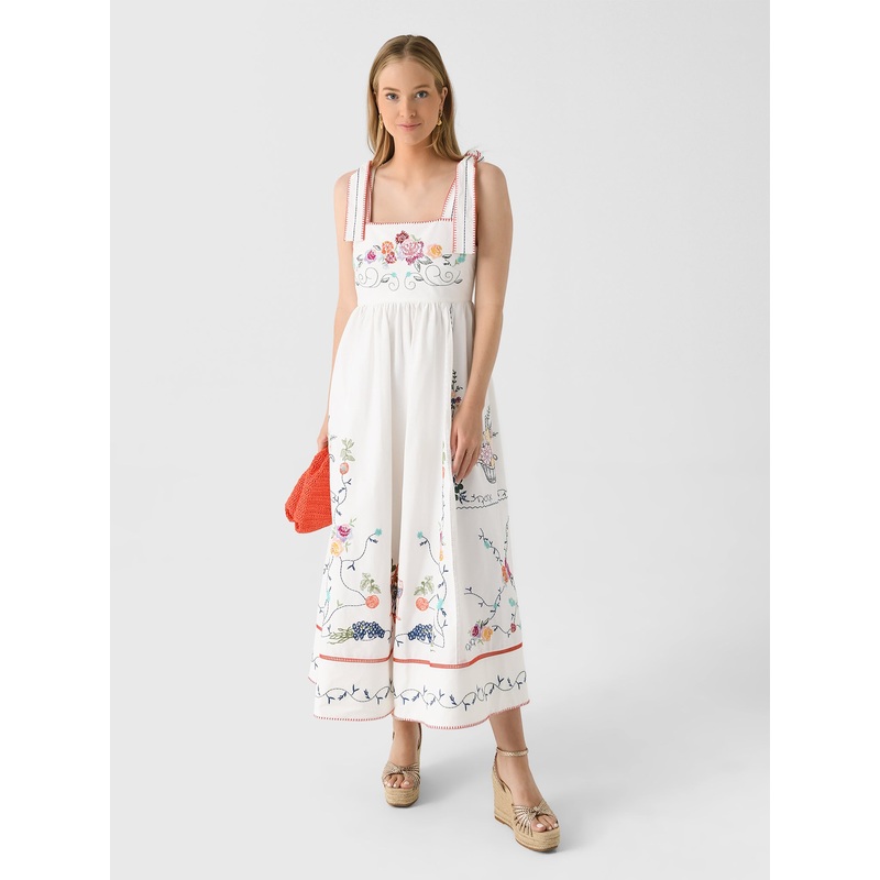 DESCRIPTION:A mid-length dress made from cotton canvas with self-tie straps and an intricate embroidered print.FEATURES:Square NecklineSelf-Tie StrapsBack Zip ClosureGathered SkirtMidi SilhouetteAll-Over Embroidered Print100% Cotton CanvasClassic FitModel