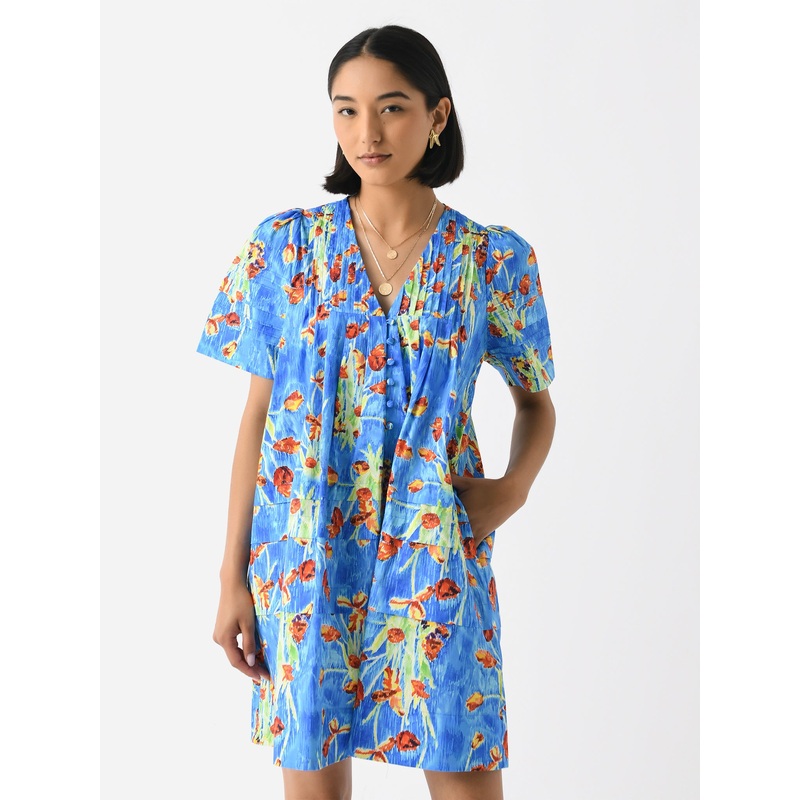 DESCRIPTION:A mini trapeze dress made from tulip-printed cotton poplin with a pleated yoke and pintucked details throughout.FEATURES:V-NecklinePleated YokePartial Button PlacketSide PocketsPintucked DetailsMini LengthTrapeze Silhouette100% Cotton PoplinRel