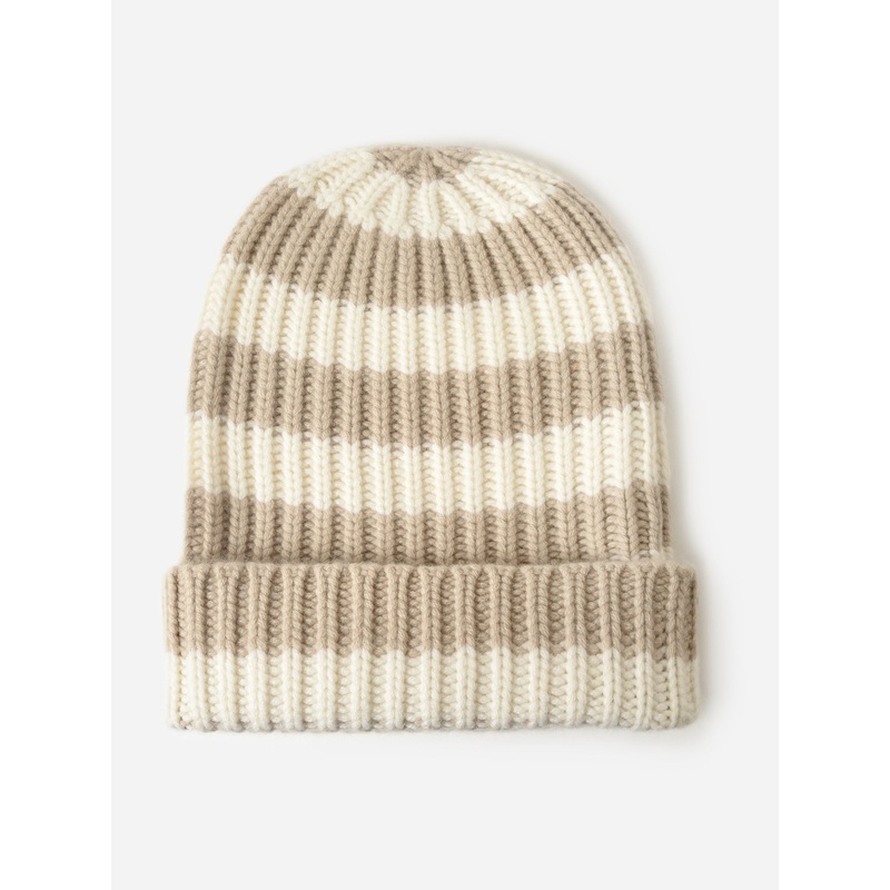 A classic beanie made from chunky knit cashmere with a two-tone stripe design.