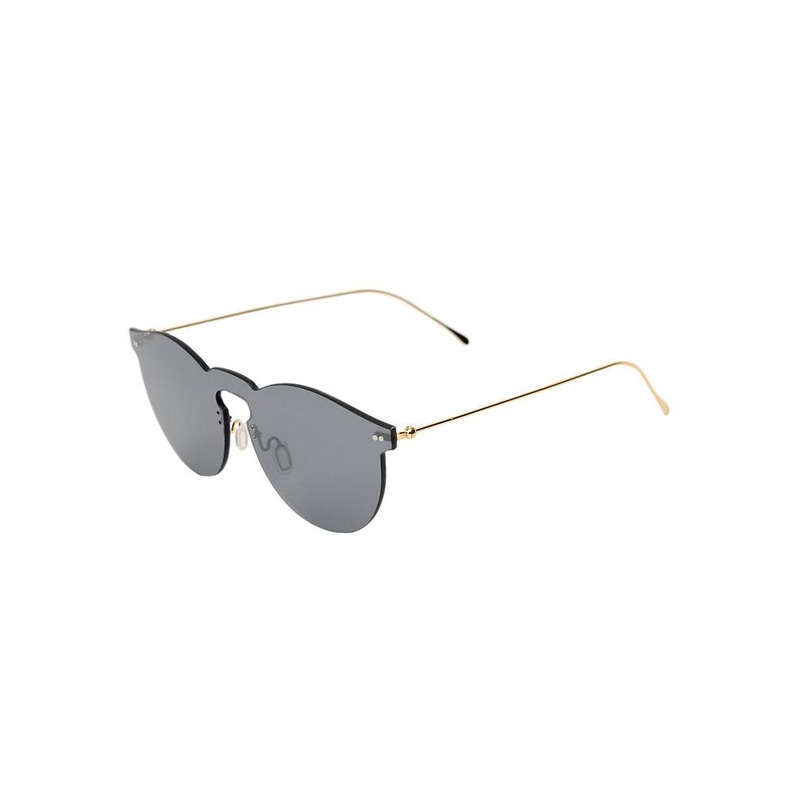 The frameless Illesteva Leonard I Mask in metal floats on the face with a mirrored finish. Slim, textured metal arms