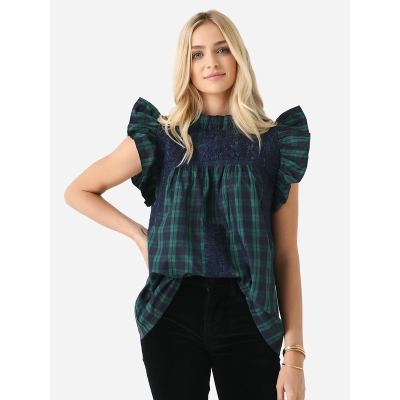 DESCRIPTION:A flowy top made with a green and navy gingham print with matching tonal embroidery.FEATURES:Ruffle CollarRuffle SleevesEmbroidered DetailsAll-Over Plaid PrintLightweight FabricationClassic FitModel is wearing size Small top.Model's Measurement