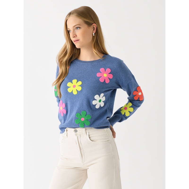 A soft cotton sweater with a dropped shoulder design and bright floral appliqus.