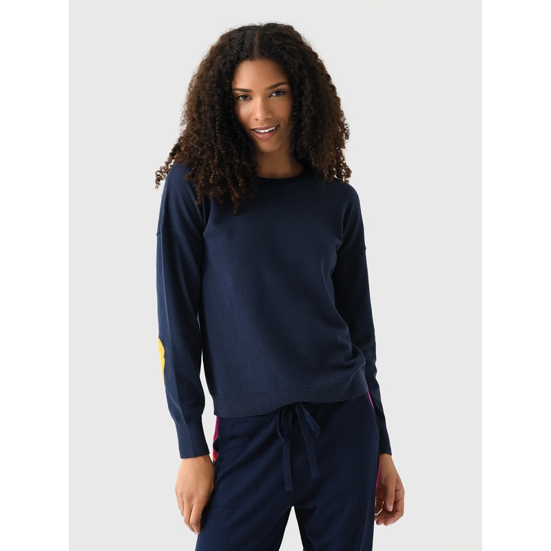 A soft cotton sweater featuring contrast paprika stitch heart patches on the sleeves.