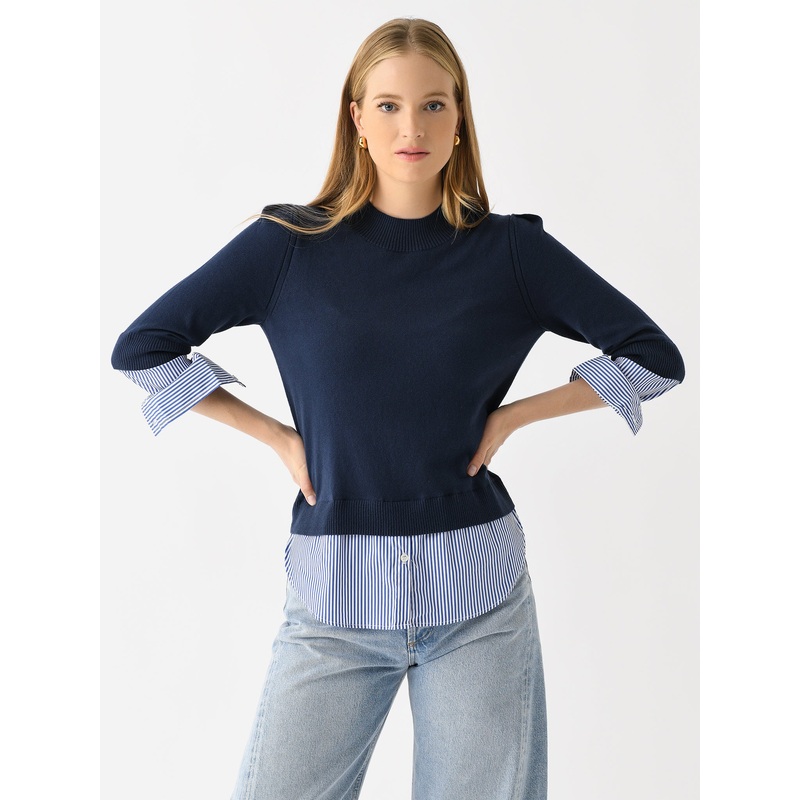 DESCRIPTION:Cotton crewneck sweater with a layered shirt design.FEATURES:Crew NecklineButton CuffsRibbed TrimsShirttail Hem100% CottonClassic FitModel is wearing size Small sweater.Navy, Lavender: Model's Measurements: Height: 5'9.5" | Bust: 32C | Waist: 2