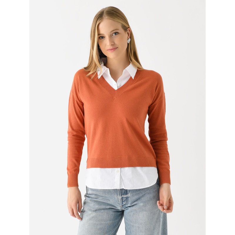 A lightweight v-neck sweater and button-down shirt with a layered design.