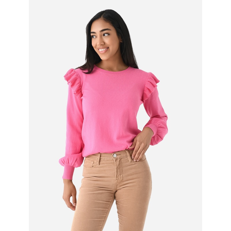 A soft cotton sweater featuring a ruffle shoulder detail and puff sleeves.