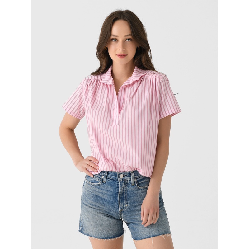 DESCRIPTION:A lightweight, short sleeve flowy top with a structured collar.FEATURES:Spread CollarV-NecklineShort SleevesLightweight FabricationClassic FitModel is wearing size Small top.Pink Stripe: Model's Measurements: Height: 5'10.5" | Bust: 32C/D | Wai