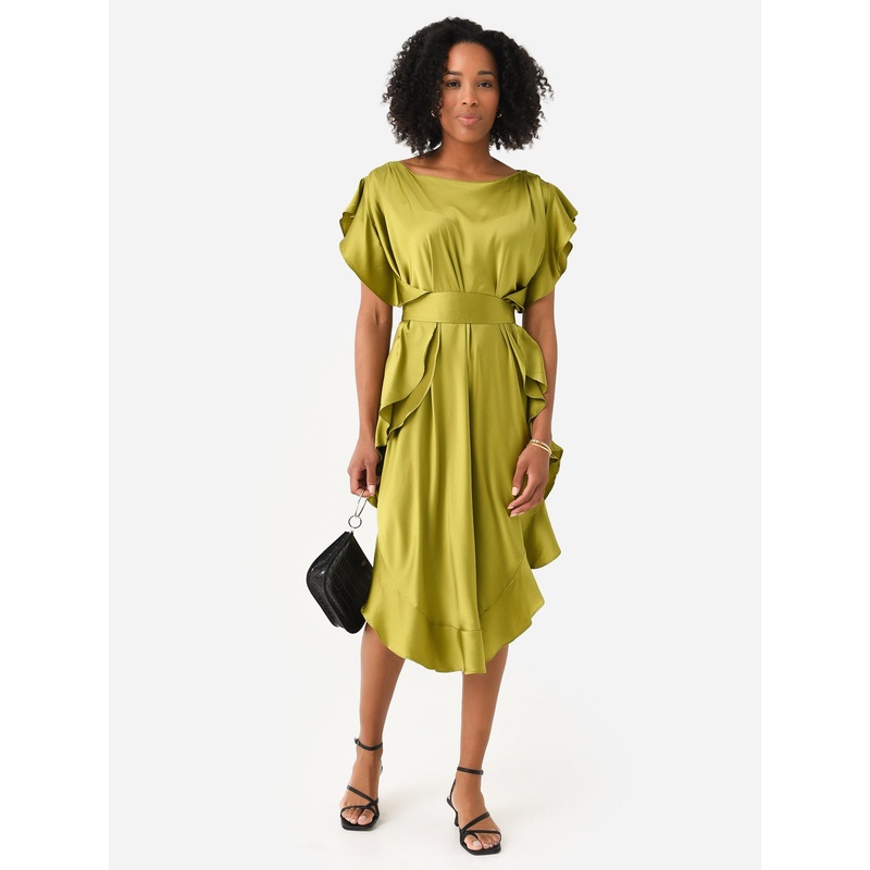 DESCRIPTION:Versatile midi dress with an asymmetrical silhouette and an optional belt.FEATURES:Midi DressRound NecklineCan Be Worn Off The ShoulderShort Ruffle SleeveOptional BeltRuffle TrimAsymmetrical SilhouetteGreen Silk: 100% SilkCoral Linen: 100% Line