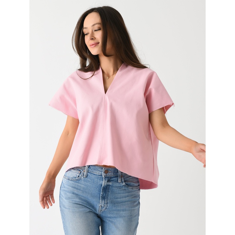 DESCRIPTION:Lightweight top with a boxy silhouette and raw edge trim.FEATURES:V-NecklineRaw Edge TrimsBoxy SilhouetteLightweight FabricationRelaxed FitModel is wearing size XS top.Pink: Model's Measurements: Height: 5'10.5" | Bust: 32C | Waist: 26" | Hips: