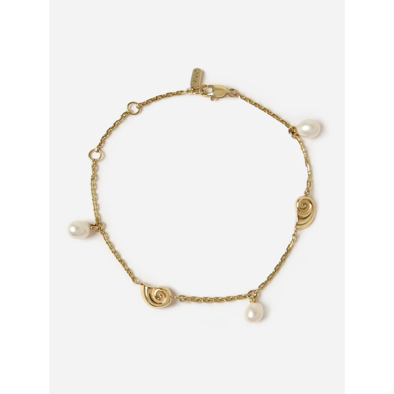 A lightweight box chain bracelet featuring freshwater pearls and nautilus shell charms.