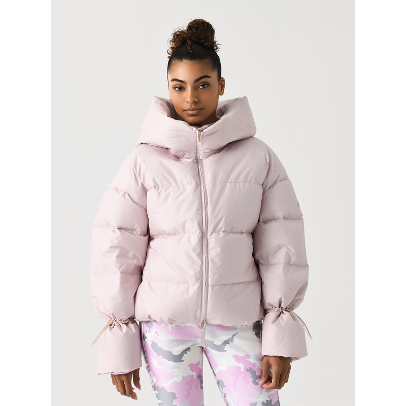 An elegant padded jacket made from nylon and silk with synthetic insulation and a wind and water-resistant finish.