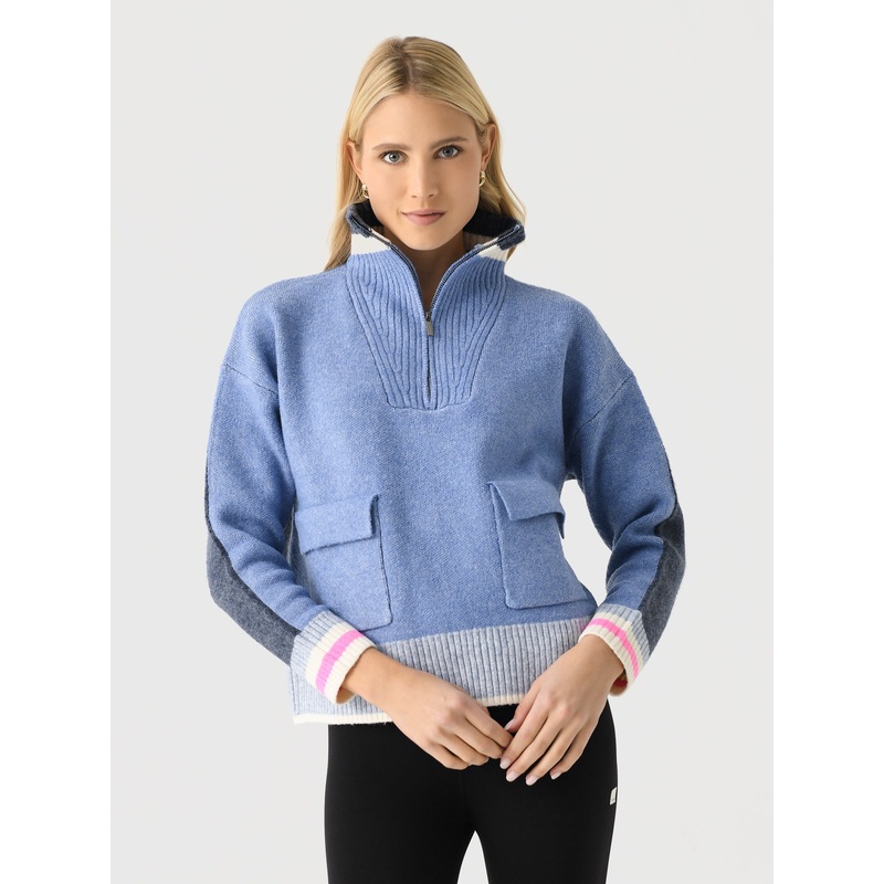 DESCRIPTION:An oversized quarter-zip sweater with a large collared neckline and multi-colored details.FEATURES:Large CollarQuarter-Zip ClosureDropped ShoulderFlap PocketsRibbed Neckline, Cuffs and HemKnit Fabrication74% Acrylic, 22% Polyester, 4% SpandexRe