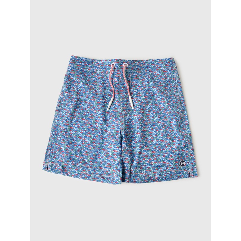 A fish-printed swim trunk made from lightweight fabric and finished with a half-elastic waistband with adjustable drawstrings and a mesh lining.