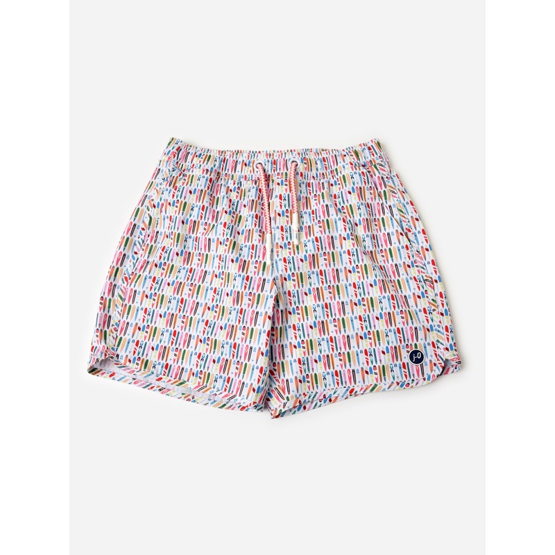 DESCRIPTION:A lightweight swim trunk with a mesh lining and custom surfboard print.