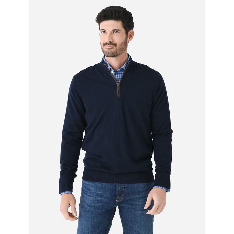 DESCRIPTION:Soft knit pullover with a suede zipper placket.FEATURES:Stand-Up CollarQuarter-Zip ClosureRibbed Neckline, Cuffs and HemKnit FabricationCotton BlendClassic FitModel is wearing size Medium quarter-zip.Model's Measurements: Height: 6'1.5" | Waist