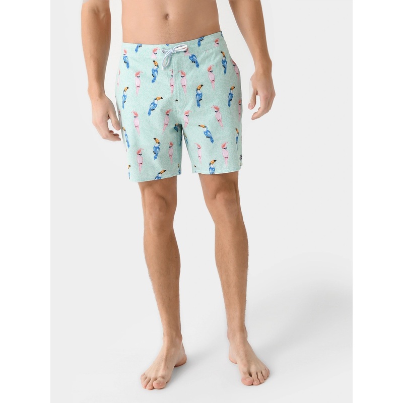 A quick-drying swim trunk with a colorful custom parrot print.
