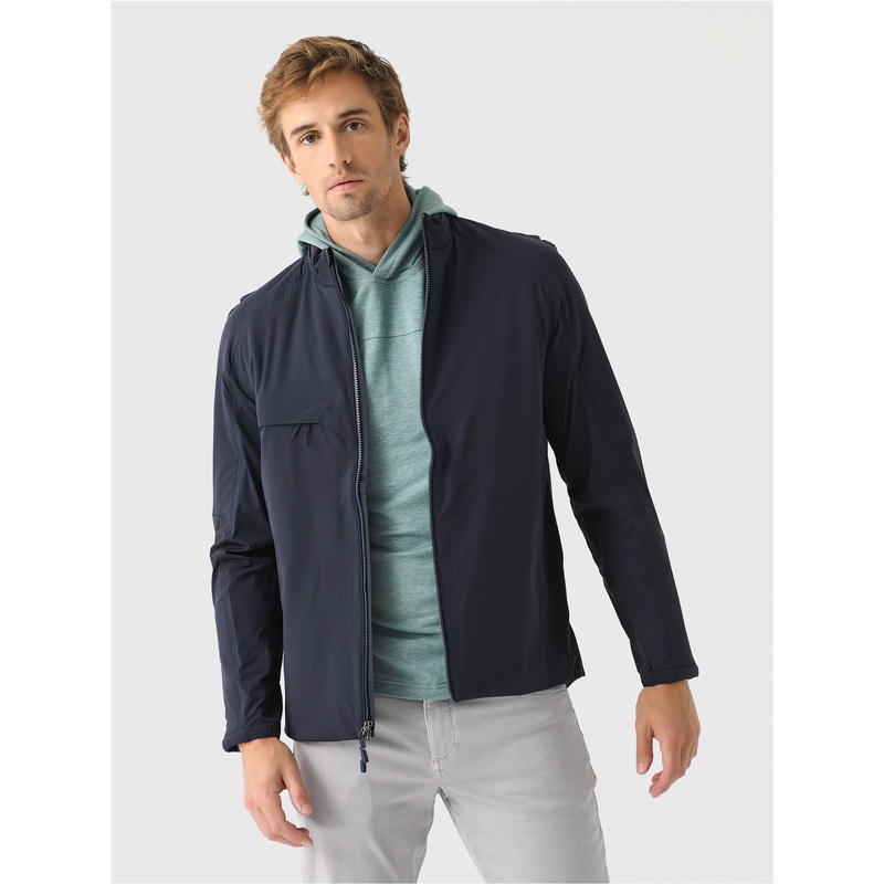 DESCRIPTION:A water-resistant jacket with a packable hood, pockets, and two-way zip closure.FEATURES:Packable HoodZip Chest PocketSide PocketsTwo-Way Zip ClosureWater-Repellent Finish85% Nylon, 15% SpandexClassic FitModel is wearing size Medium jacket.Mode