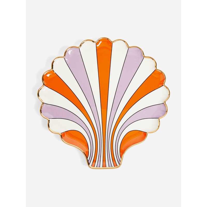 DESCRIPTION:Porcelain trinket tray featuring a two-tone mod stripe pattern with gold accents.FEATURES:Trinket TrayShell ShapeStripe Pattern with Gold AccentsMaterial: High-Fired PorcelainDimensions: 8 in. x 8 in. x 0.5 in.One Size