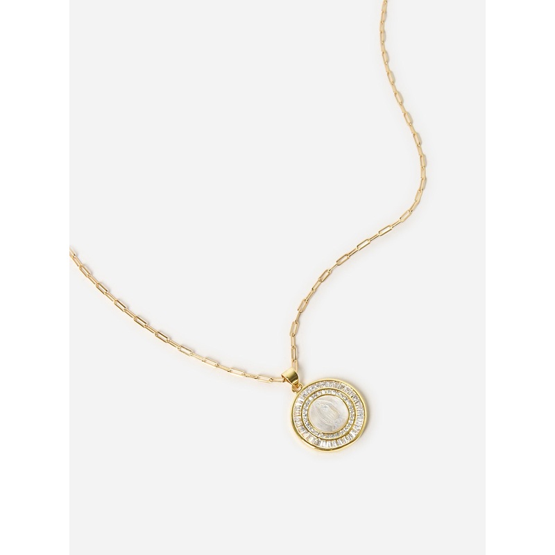 DESCRIPTION:A gold-plated brass necklace featuring a mother-of-pearl Mary pendant with cubic zirconia baguette accents.