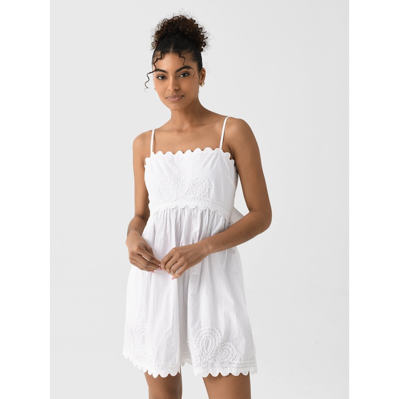 DESCRIPTION:A chic mini dress made from airy cotton with a back tie closure, scalloped trims, and intricate embroidery.FEATURES:Square NecklineThin, Adjustable StrapsBack Tie ClosureSide PocketsEmbroidered DesignScalloped TrimsMini Silhouette100% CottonCla