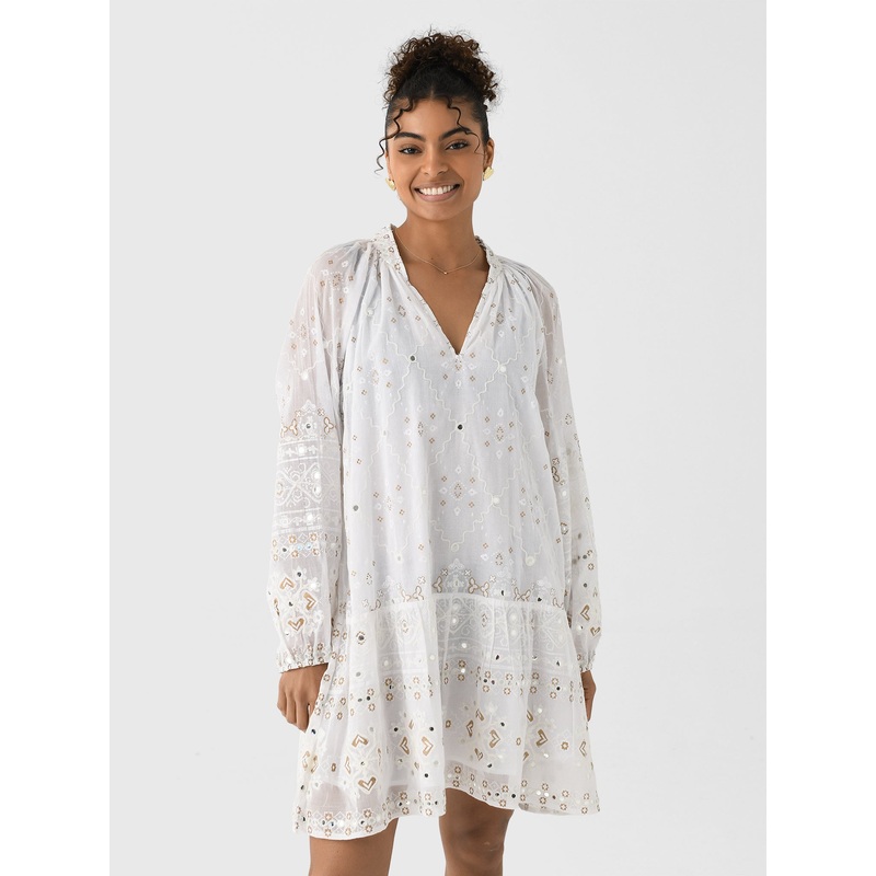 DESCRIPTION:A tunic-style dress made from lightweight cotton and finished with an embroidered print and intricate mirror embellishments.FEATURES:V-NecklineBlouson SleevesTiered SkirtEmbroidered DesignMirror EmbellishmentsMini Silhouette100% CottonRelaxed F