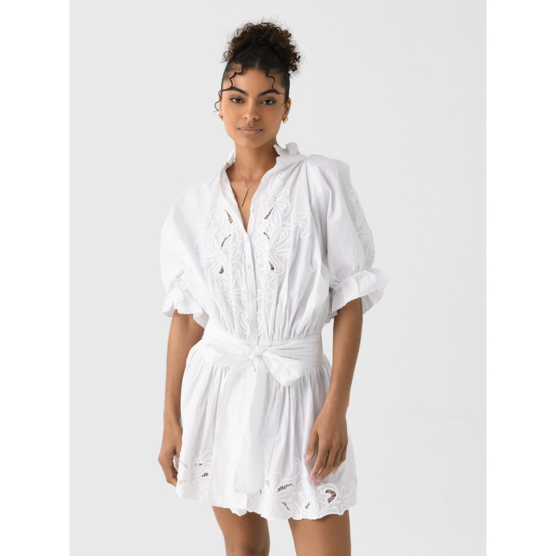 DESCRIPTION:A flowy blouson-style dress made from lightweight cotton with a self-tie belt and intricate eyelet embroidered details.FEATURES:Ruffle CollarV-NecklineHalf-Length Puff SleevesButton-Down FrontSelf-Tie BeltEyelet Embroidered DesignMini Silhouett