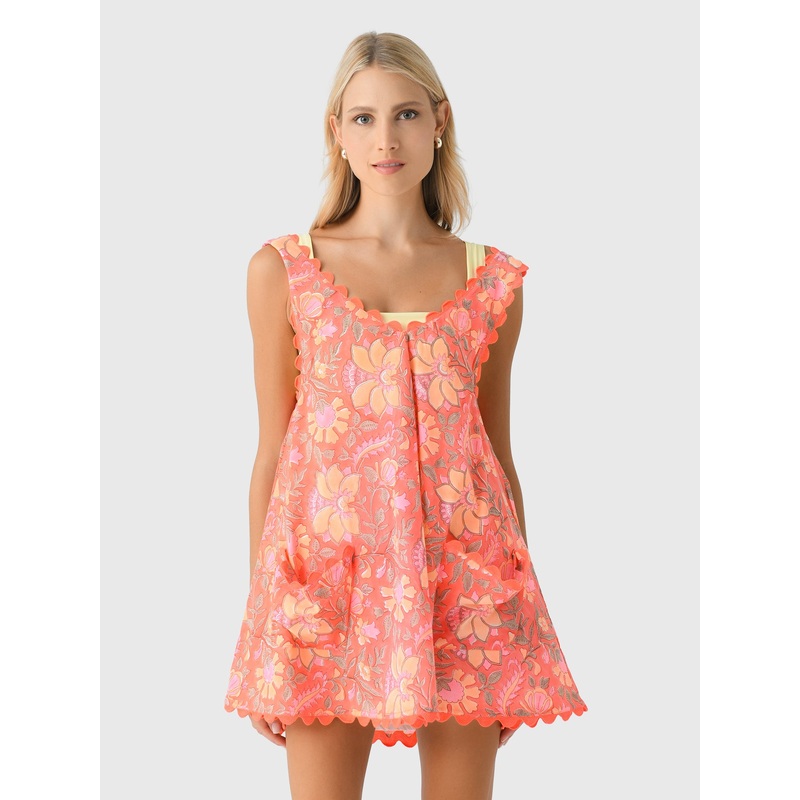 DESCRIPTION:An oversized mini dress with a colorful floral block print, patch pockets, and ric-rac trims.FEATURES:Scoop NecklineWide StrapsLow BackPatch PocketsRic-Rac TrimsMini SilhouetteAll-Over Novelty Print100% CottonRelaxed FitModel is wearing O/S dre