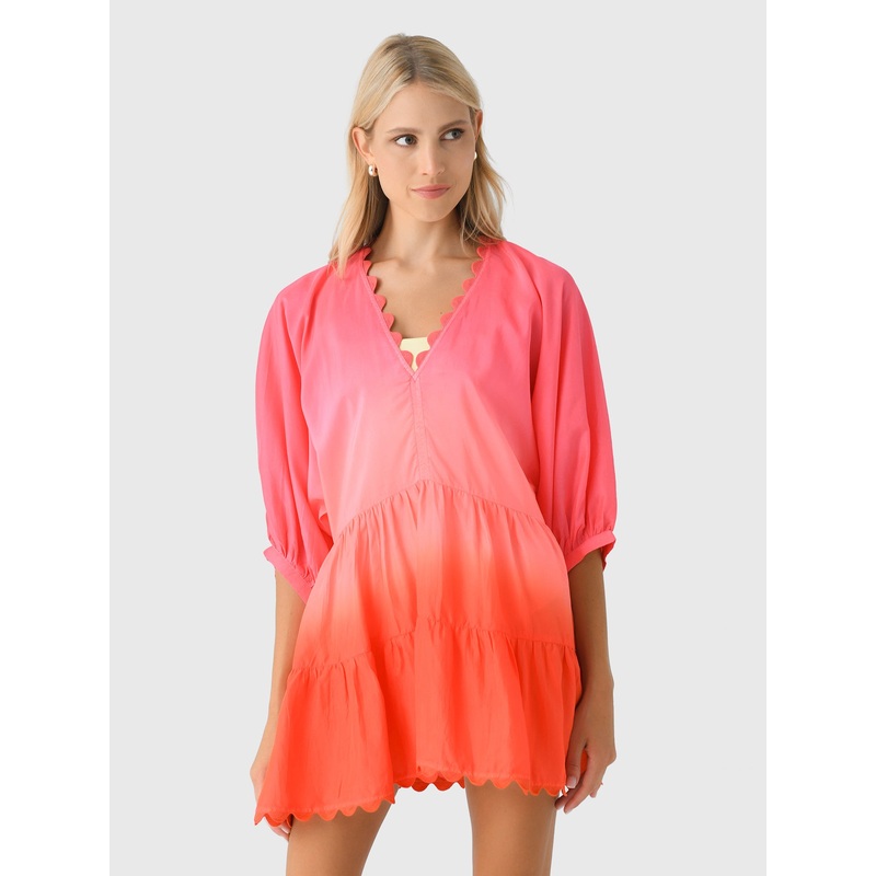 DESCRIPTION:A light and flowy mini dress made from luxurious silk with puff sleeves and an ombre design.FEATURES:V-NecklinePuff SleevesTiered SkirtRic-Rac TrimsOmbre DesignMini Silhouette100% SilkRelaxed FitModel is wearing size 1 dress.Model's Measurement