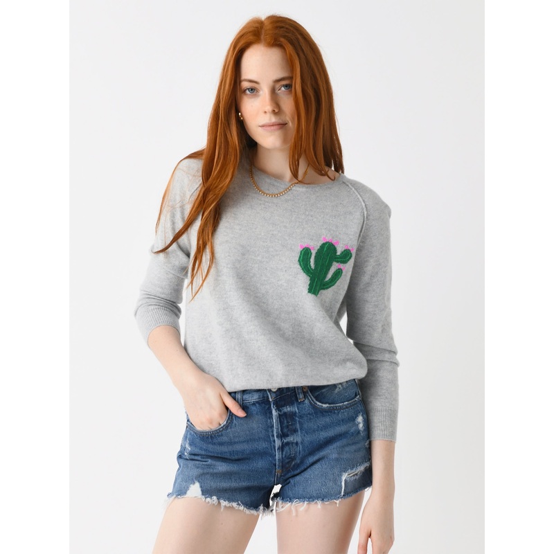 A sumptuous cashmere crewneck sweater featuring a fun cactus intarsia detail.