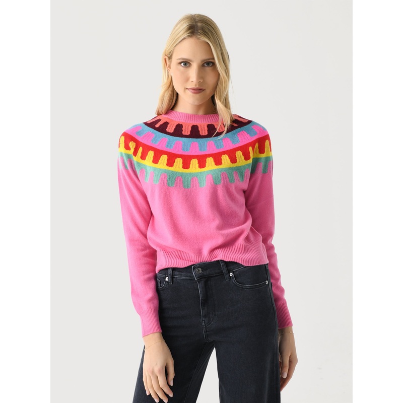 A soft cashmere crew sweater featuring a multi-colored ric-rac design at the yoke.