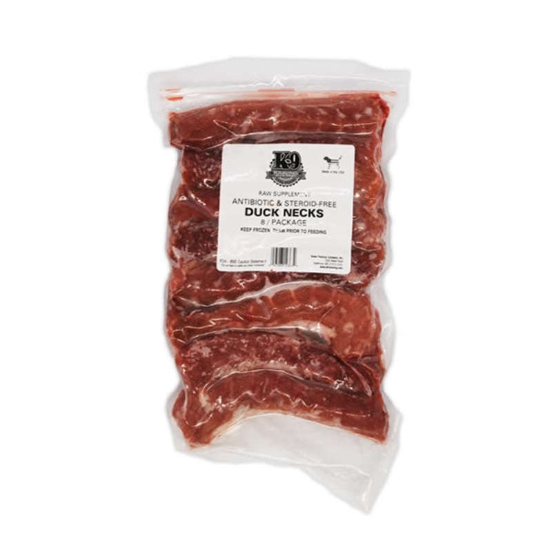 Our frozen raw duck necks are top of the line and are for the raw feeding purist. K-9 Kraving Frozen Raw Duck Necks are: 100% USA, USDA Inspected & Approved, 100% Natural, Single Sourced, Steroid & Antibiotic-Free and Free-Range. Retail pouches are re-seal
