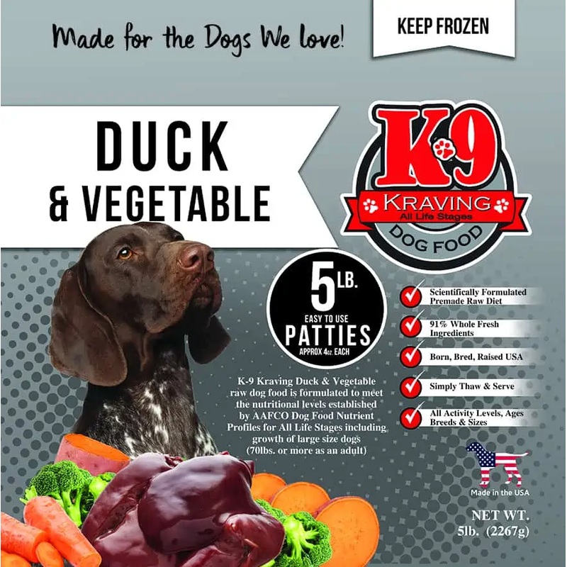 K-9 Kraving Duck & VegetableComplete & Balanced Diet For all life stages, including large breed puppies over 70 lbs.INGREDIENTS:Duck Breast Meat, Duck Organ Meat (Heart, Gizzards & Liver), Fresh Ground Duck Bone, Fresh, Low-Carb Vegetables (Broccoli, Carro
