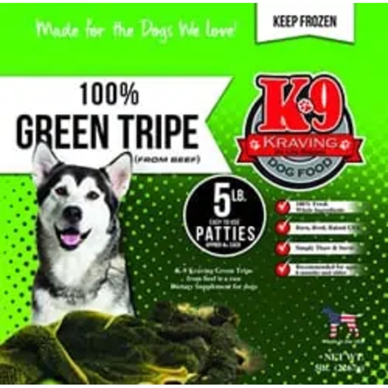 K-9 Kraving Green (Beef) TripeRaw Dietary SupplementINGREDIENTS:100% Green Tripe (from healthy bovine)GUARANTEED ANALYSIS:Crude Protein: 12.9%Crude Fat: 14%Crude Fiber: 2.4%Moisture: 70%Calcium: .08%Phosphorous: .13%Kcal/Oz (as fed): 51Key Features: K-9 Kr